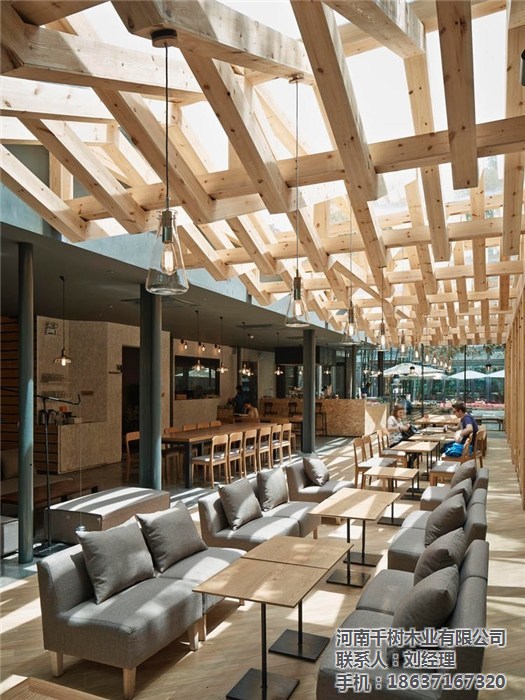 且新增的木梁在原有的鋼梁結構之間交織穿梭,形成豐富有層次的光影效果,尤其是在天氣晴好的時候,體驗感更為直接。對于空間區(qū)域的分割,設計團隊也著手從天花板部分來創(chuàng)造。比如前述提到的主要的編織木梁結構,其下方的空間寬敞明亮,更適合于那些喜愛沐浴在陽光或自然天光之下的客人們。而靠近建筑內部的空間,在灰黑色的天花板映襯之下,則要顯得沉穩(wěn)、私密一些,顯然更適合那些需要安靜空間的客人們。