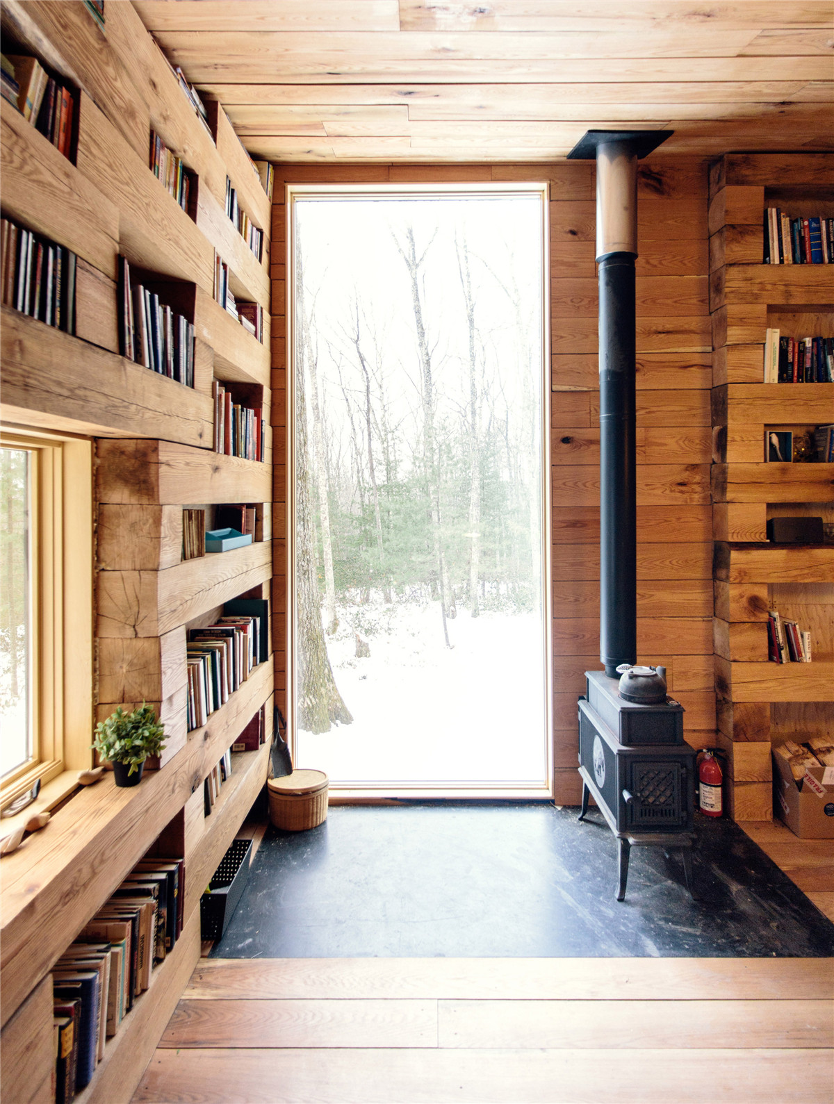 水平放置的木條一個接一個豎向堆疊,構(gòu)成了小屋的墻壁。它們之間的縫隙變成了書架,更大的開口就成了窗戶。