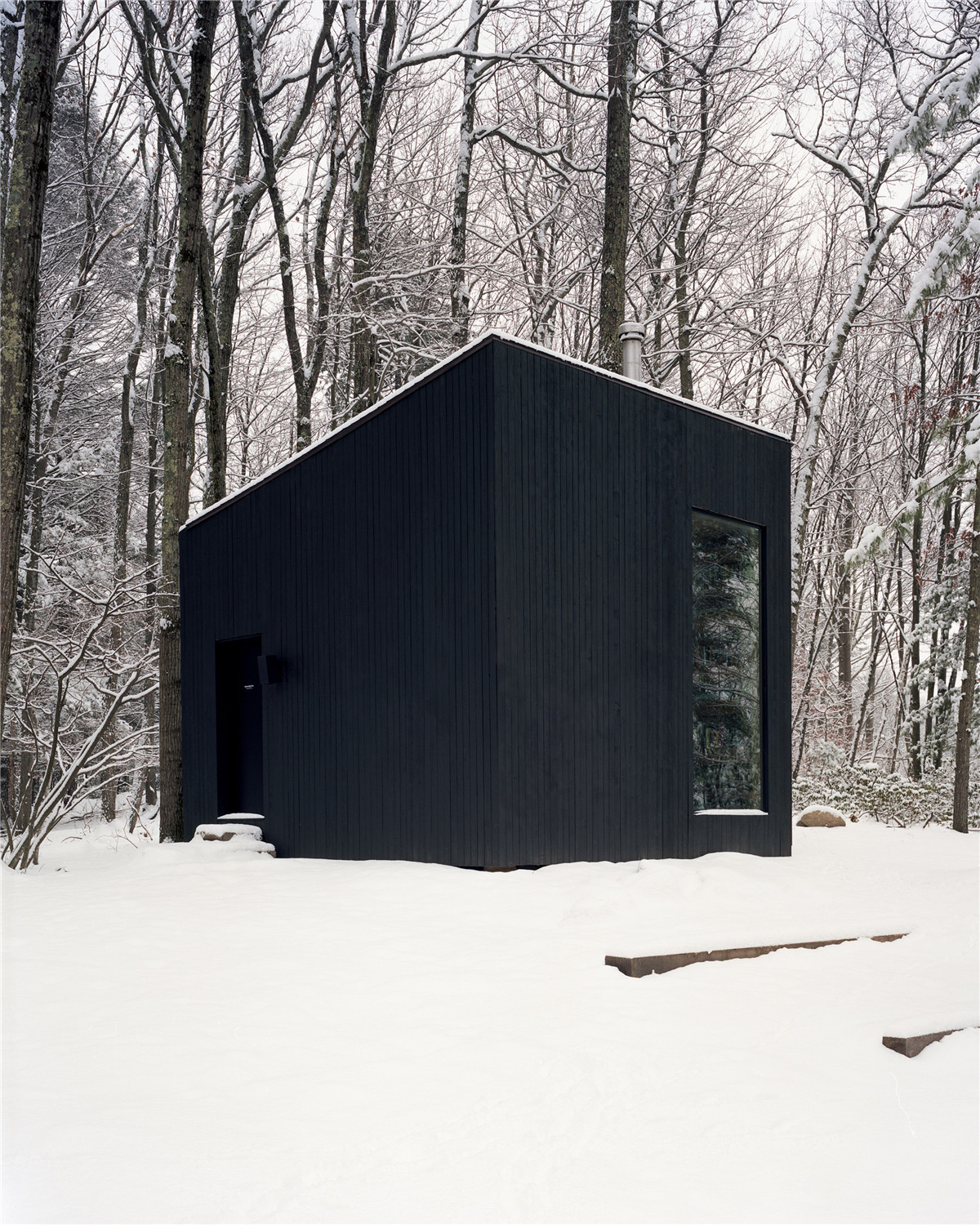 黑色的垂直木條包裹著這座小小的僻靜房子。“這孤獨的黑色體塊,景色的強烈地佇立著,是冬日里神秘的存在,”Padron說。
