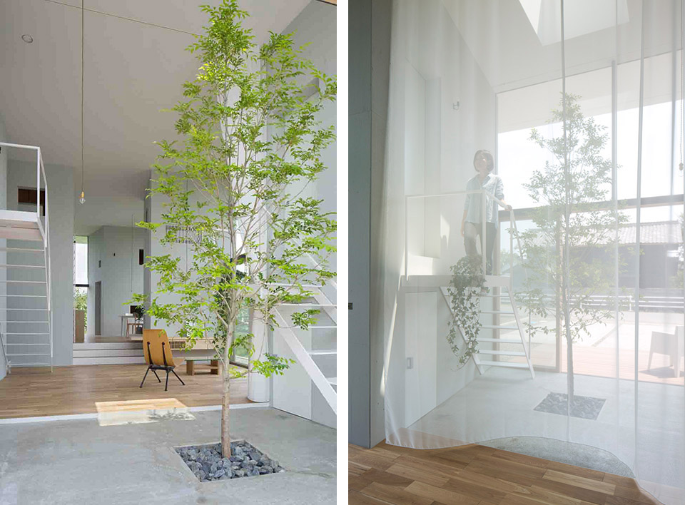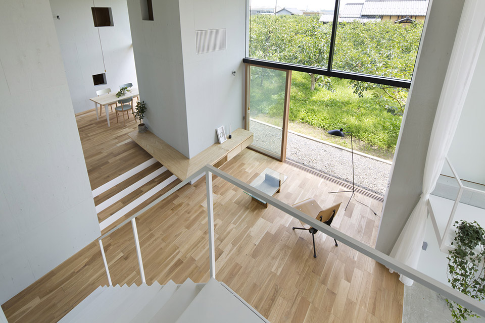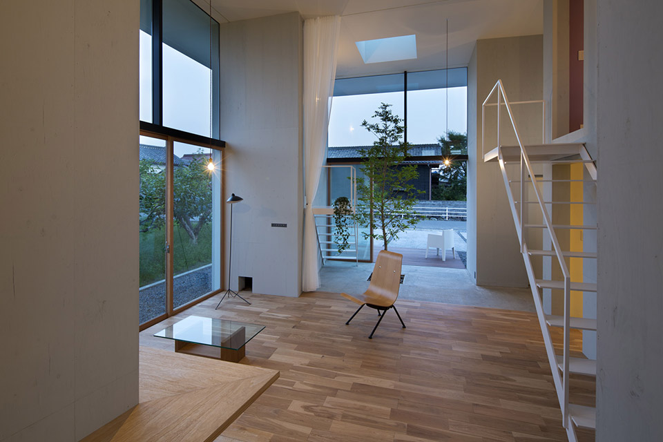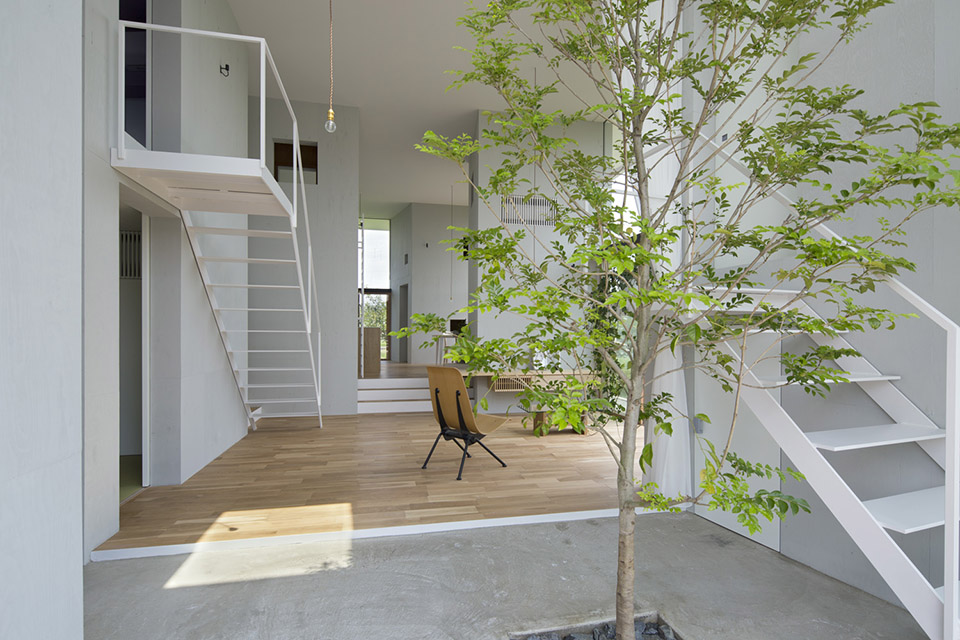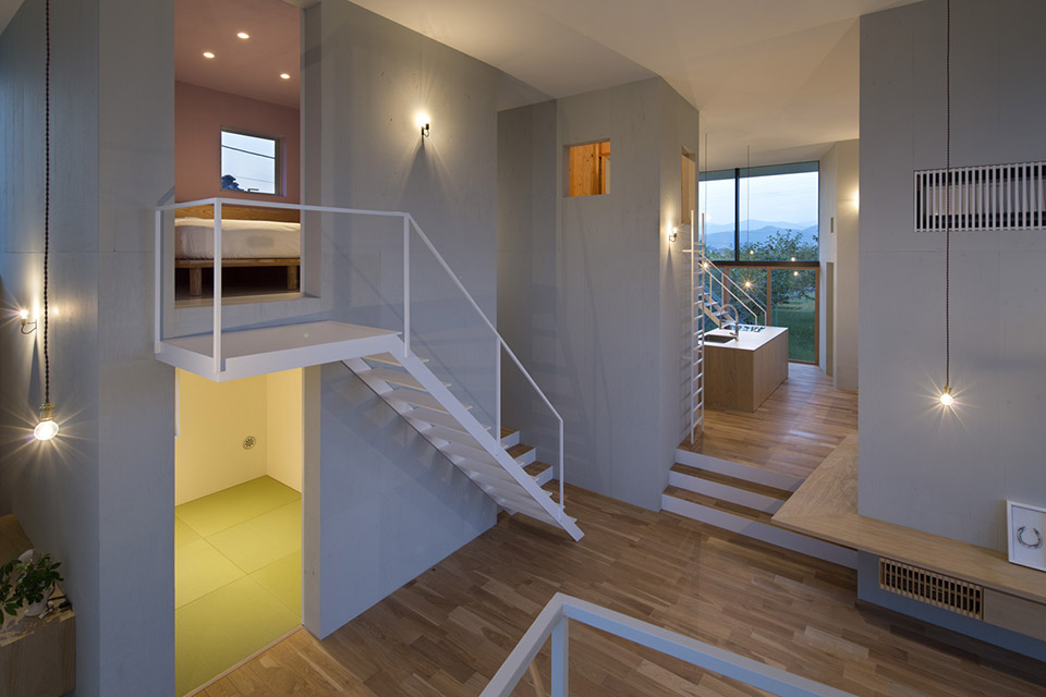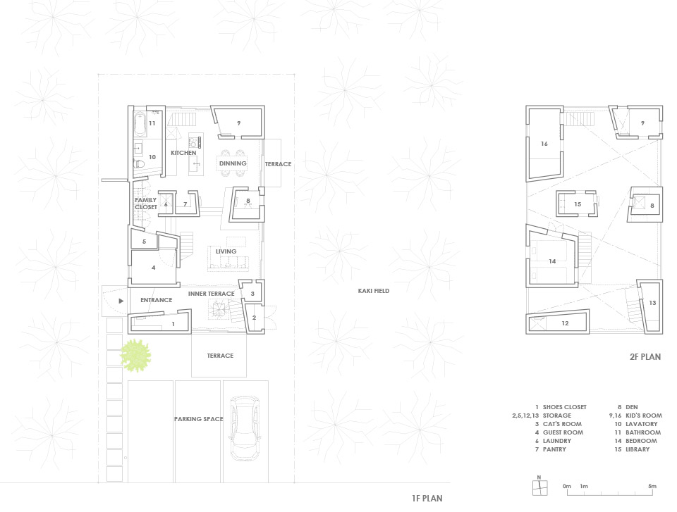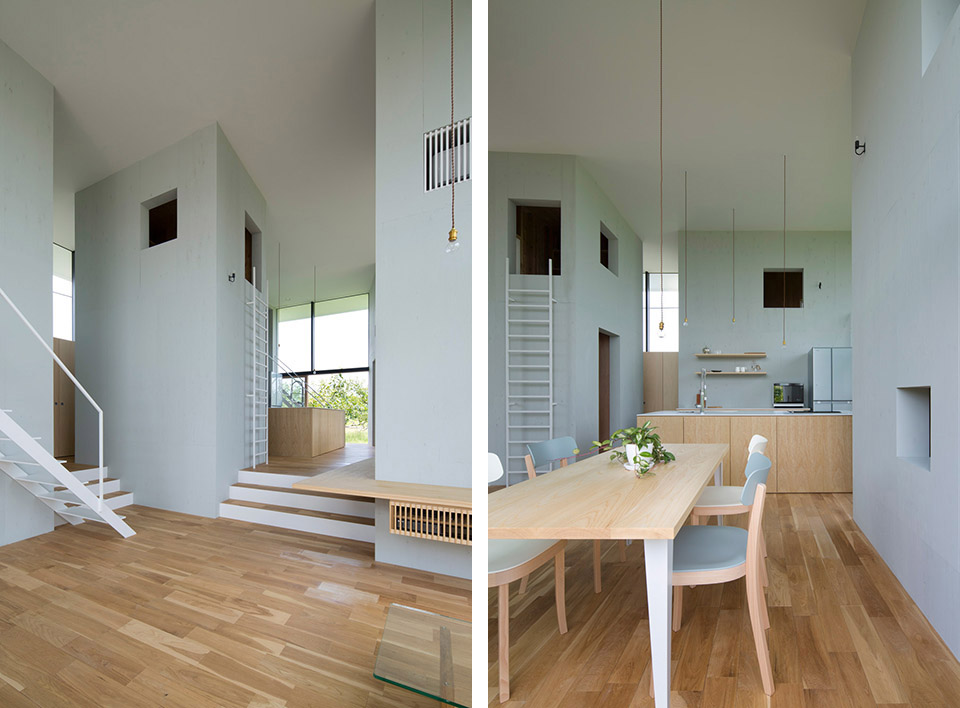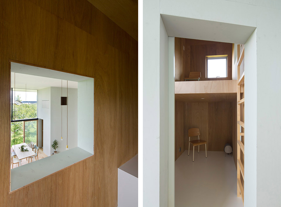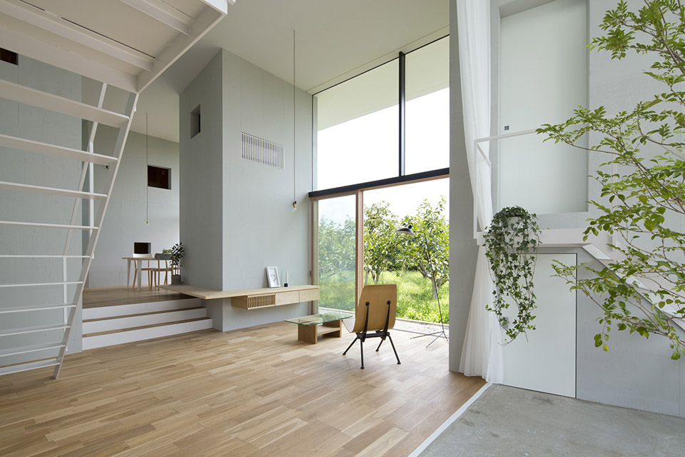 對自然開放,并受到果樹圍繞的室內(nèi)公共空間讓人感到開闊而放松。公共空間的室內(nèi)高度有兩層層高的尺度,為了利用結(jié)構(gòu)體的上層空間,每個都有專用樓梯到達(dá)上層,其中四個樓梯放置在公共空間中,還有三個爬梯分別放置在相對應(yīng)的結(jié)構(gòu)體自身中。