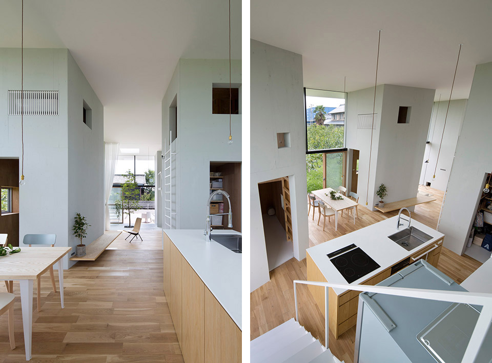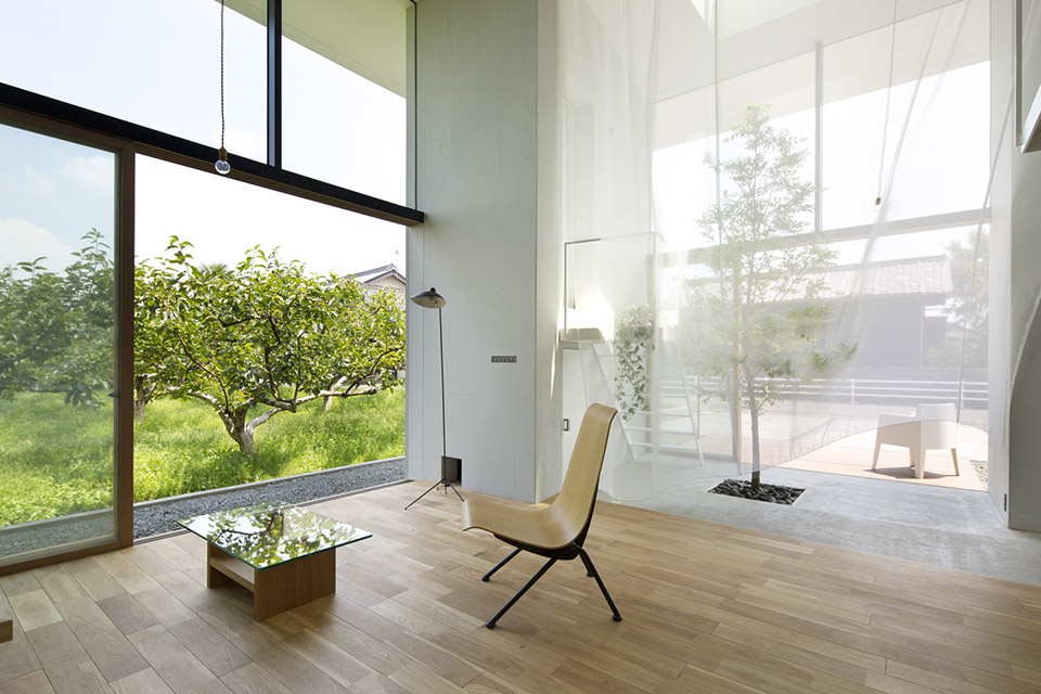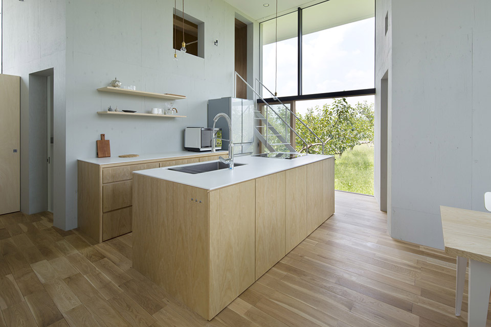 果園內(nèi)的樹木成為了住宅的天然隱私屏障與自然風(fēng)景。身處其間的住宅構(gòu)架開放,可以簡單理解為7個結(jié)構(gòu)體支撐起一個巨大的屋頂,這七個結(jié)構(gòu)體有相當(dāng)?shù)暮穸?,所有的私人空間比如衛(wèi)生間和臥室都位于其中,而7個結(jié)構(gòu)體之間,屋頂下方的自由空間,是住宅的公共空間—客廳,餐廳,廚房。