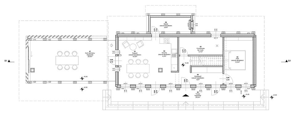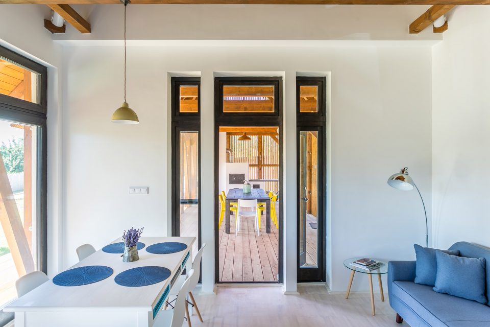 建筑采用自承重木結(jié)構(gòu),隔離墻放置在柱子之后。除外部露臺不設(shè)隔墻外,其自身結(jié)構(gòu)與建筑主體結(jié)構(gòu)并無二異。建筑設(shè)計(jì)充分遵循業(yè)主的設(shè)計(jì)要求,同時(shí)嚴(yán)格遵守Balaton丘陵地區(qū)的建設(shè)標(biāo)準(zhǔn)。