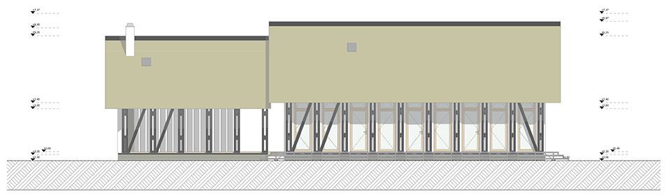 被強(qiáng)化的建筑結(jié)構(gòu)進(jìn)一步實(shí)現(xiàn)了度假屋的設(shè)計(jì)理念。以1.4米間隔成對出現(xiàn)的結(jié)構(gòu)柱式形成了建筑的主立面。玻璃門窗沿立面鋪設(shè),賦予了陽光足量的穿行空間,讓人的生活與自然環(huán)境充分接觸。