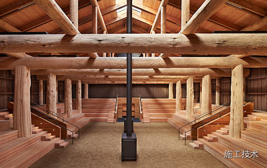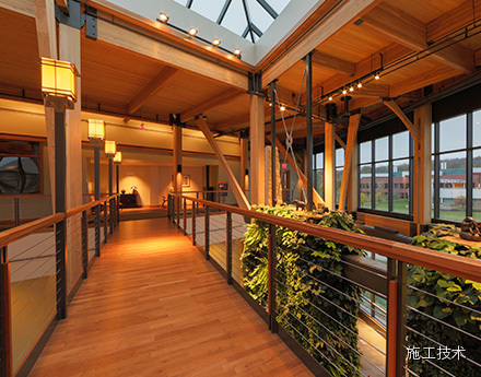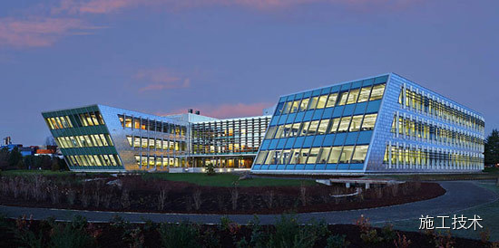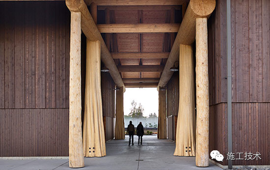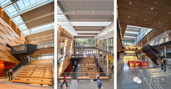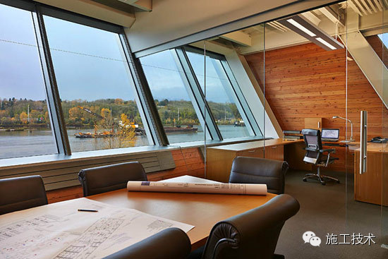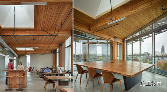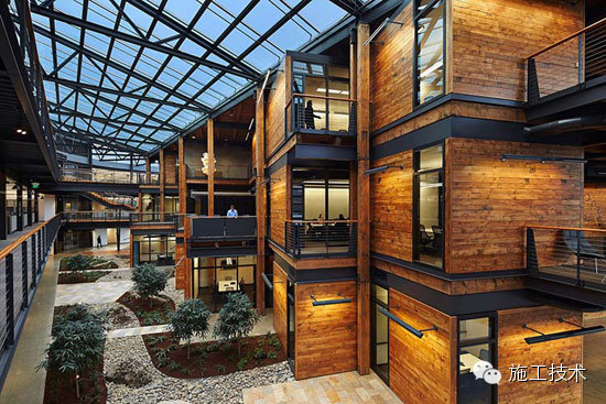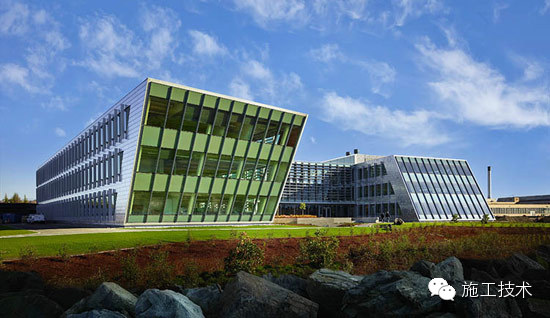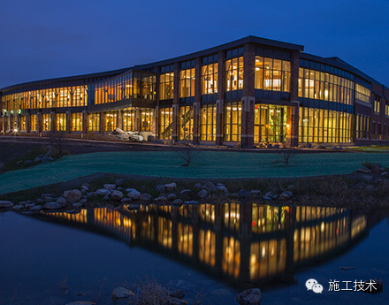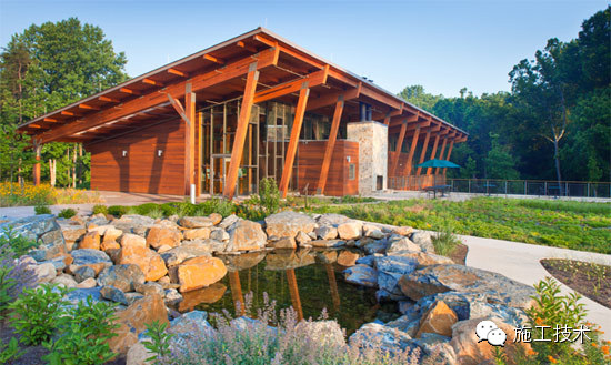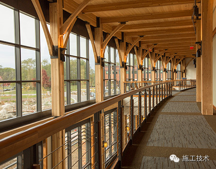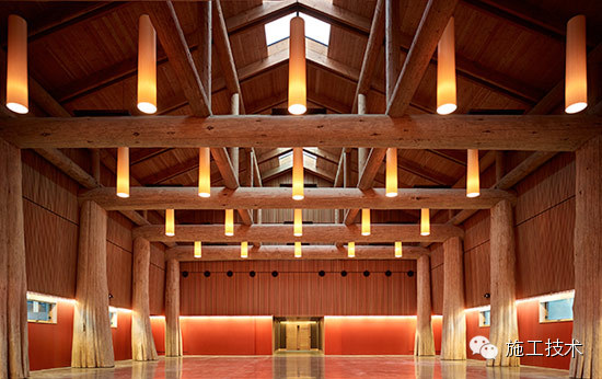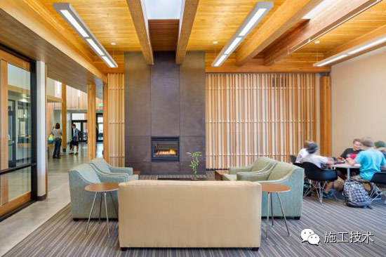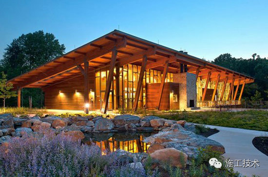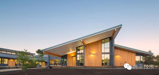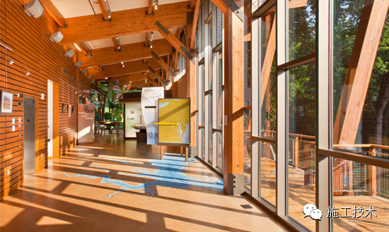 建筑物的桁架為膠合層壓板,從而優(yōu)化了這種可再生資源的結(jié)構(gòu)價(jià)值。膠合板消耗能源少于鋼筋混凝土或鋼材,可用于更長(zhǎng)的時(shí)間跨度,可承受重負(fù)荷,并且擁有復(fù)雜 的形狀。該建筑通過(guò)了LEED環(huán)境保護(hù)認(rèn)證,包括一套可再生的膠合板結(jié)構(gòu)系、節(jié)水管道夾具、利用可回收的當(dāng)?shù)夭牧?、室?nèi)擁有豐富的自然光線以及高效的機(jī)械 系統(tǒng)、照明和外表皮。