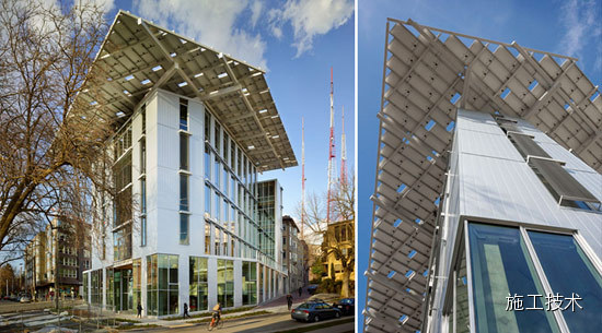 該建筑通過(guò)各種不同的系統(tǒng)達(dá)到以下這些目標(biāo),如一個(gè)高性能的建筑圍護(hù)結(jié)構(gòu);一個(gè)旨在優(yōu)化自然光的布局,估計(jì)有82%的中心空間將利用自然光采光。仔細(xì)與租戶 協(xié)調(diào),通過(guò)使用高效率的顯示器、復(fù)印機(jī)、筆記本電腦、零客戶端和基于云的服務(wù)器,以減少他們約75%的“插頭負(fù)載”。26孔、400英尺深的地源熱泵空調(diào) 系統(tǒng),將從地球收獲的能源來(lái)提供高效的加熱和冷卻,地板輻射系統(tǒng)將有效地加熱和冷卻辦公空間。242千瓦的屋頂太陽(yáng)能光伏陣列將提供建設(shè)所需的所有凈能量。