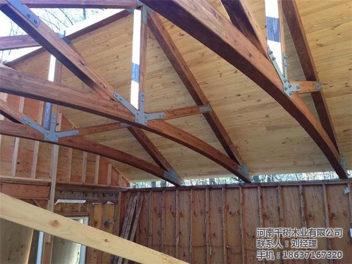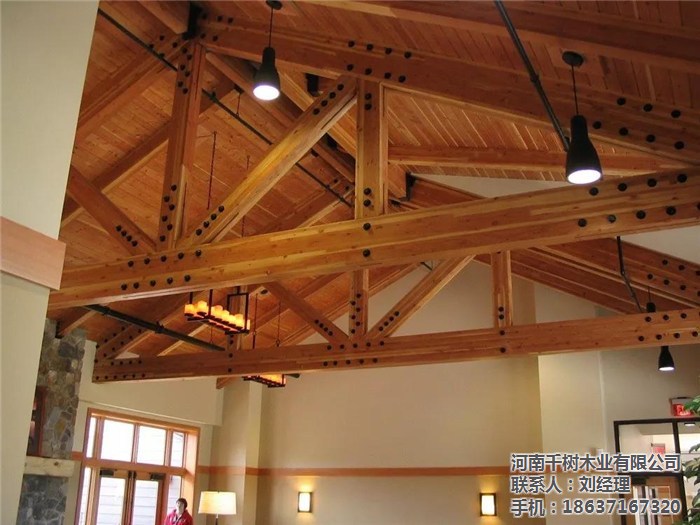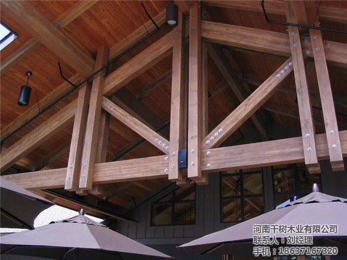 河南景區(qū)木屋桁架的外形變化多樣,可以根據(jù)所采用的屋面材料、桁架跨度、建筑造型、制造條件和桁架的受力性能等因素來確定。木桁架的外形通常有三角形、梯形及多邊形等三種,當采用膠合木結(jié)構(gòu)時,還可用拱形。