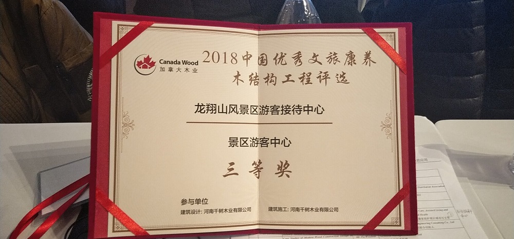 本次評選得到了木結構行業(yè)企業(yè)的積極響應,據(jù)了解,組委會共收到了總共15個大類,104個項目,47家公司報送的項目資料。其中,我公司報送了河南焦作龍翔山風景區(qū)游客接待中心項目用于參與景區(qū)游客中心組別的競選。經(jīng)過歷時兩個月的評選最終該項目喜獲景區(qū)游客中心類別三等獎!