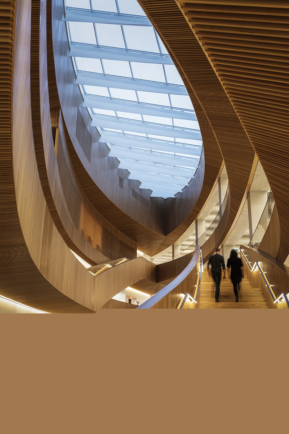 底層的外立面并未使用透明的六邊形,而是設計成了凹進去的寬闊木質拱頂,人們在進入圖書館的時候會產生被環(huán)抱的感覺。圖書館入口處結構參考了當?shù)爻R姷腃hinook云拱。入口處的雙曲面木質拱廊是世界上最大的自由曲面木質外殼之一,材質選用了不列顛哥倫比亞省西部產的紅杉木。其有機形態(tài)和質感讓大型建筑的尺度變得親密。從圖書館外面就能看到中庭,仿佛在邀請人們進入。