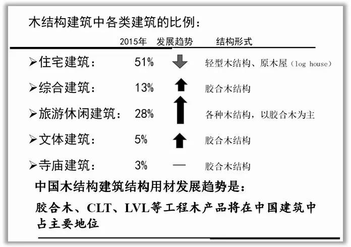 幾十年來,磚混結(jié)構(gòu)已廣泛應(yīng)用于我們的民用建筑中。施工成本低,給人以安全感,耐用性和低維護成本,而木結(jié)構(gòu)房屋不穩(wěn)定,不安全,易著火,易受害蟲害。遇水分會導(dǎo)致腐爛和霉變,因此難以接受這種新的木結(jié)構(gòu)建筑。由于對現(xiàn)代木結(jié)構(gòu)的理解不足,因而產(chǎn)生這些疑問是正常的。只要在成本,安全,保護,功能等方面采取適當(dāng)措施,通過大量的實驗比較,專業(yè)知識的宣傳,樣板房的示范,特別是中國古代木結(jié)構(gòu)建筑和文化的影響,我相信人們的思想會發(fā)生變化,而木結(jié)構(gòu)建筑的生活體驗也會影響人們的固有觀念?,F(xiàn)代木結(jié)構(gòu)完全可以被接受。下圖所示的各類木結(jié)構(gòu)建筑發(fā)展趨勢也能說明這一點。
