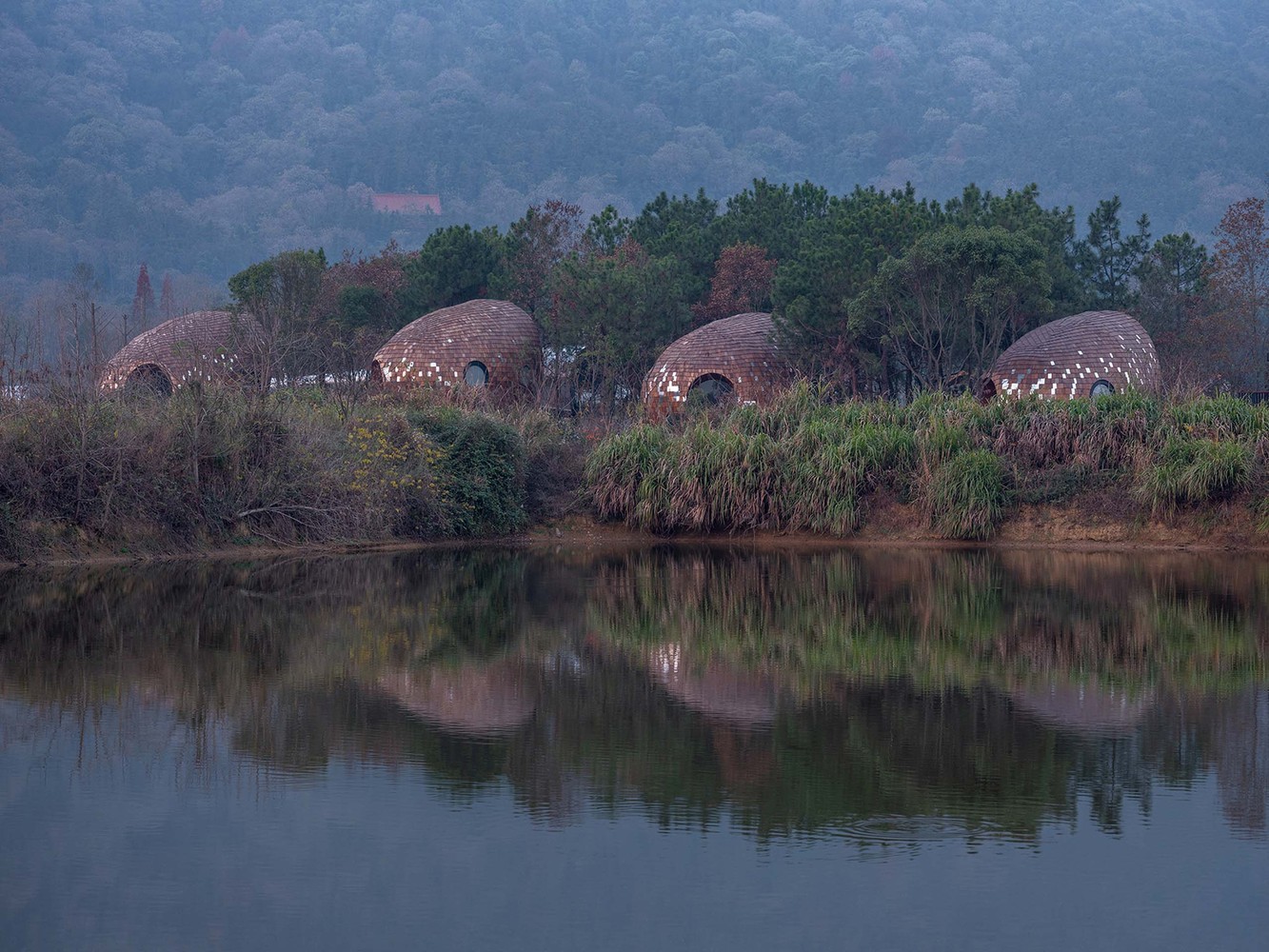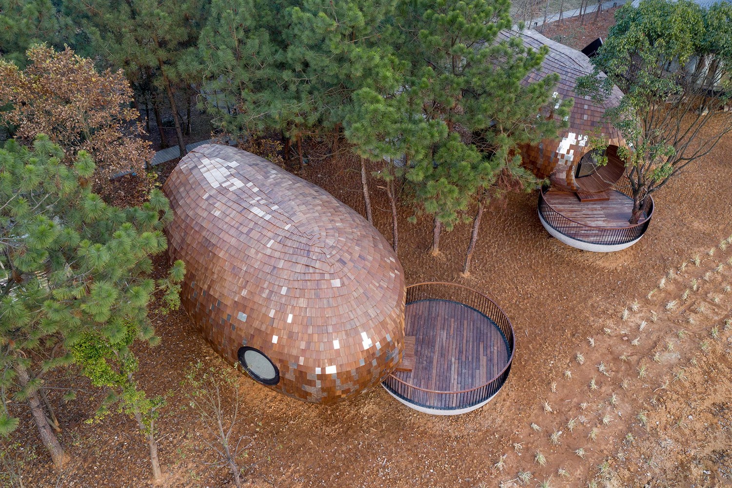 種子木屋整體呈橢球形,底部采用鏡面鋁板,往高處漸變?yōu)槟就摺gR面鋁板隨著季節(jié)、天氣的變化,反射周圍的環(huán)境和氛圍,冬季時(shí)是紅土地,春夏季時(shí)是綠植,潮濕時(shí)是氤氳霧氣,晴天時(shí)是明媚陽光。鏡面鋁板是種子屋落地生根的部分,上部的木瓦則使建筑逐漸回歸自然柔和的本質(zhì)。