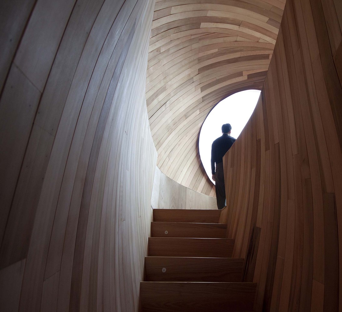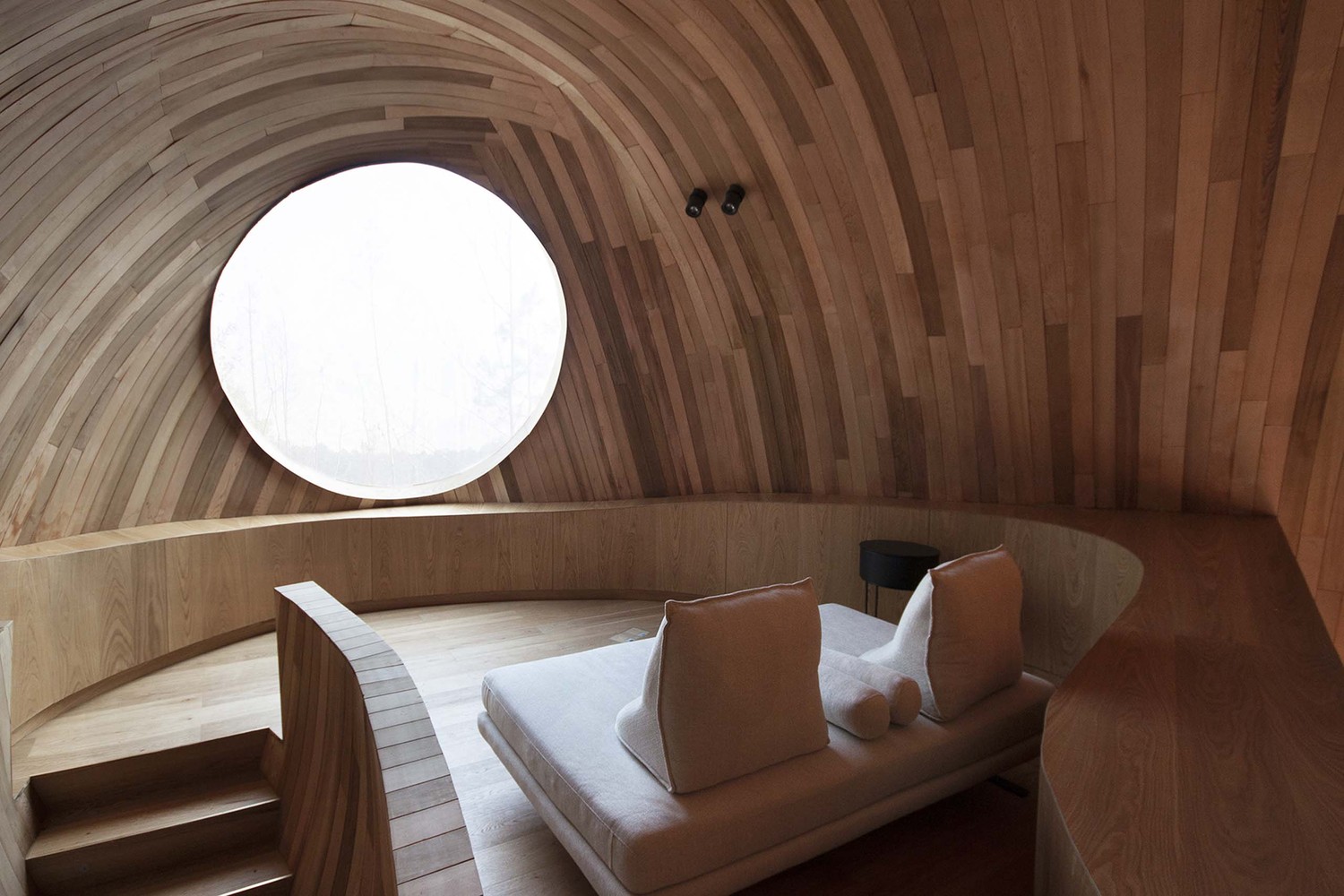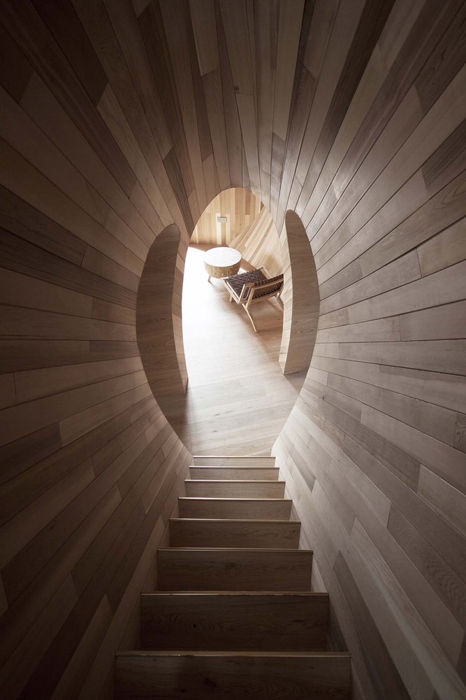 種子屋室內(nèi)墻面采用統(tǒng)一的木拼,自然的木色變化形成的條紋感,進(jìn)一步強(qiáng)調(diào)橢球形態(tài)的空間感。主臥后側(cè)體量容納入口、衛(wèi)浴、儲藏等功能區(qū),同時(shí)形成親子區(qū)閣樓。閣樓與一層通過一個(gè)插入式的橢圓柱型樓梯間連接,同時(shí)樓梯間與入口空間穿插,形成有趣的異形空間。