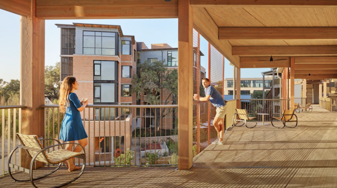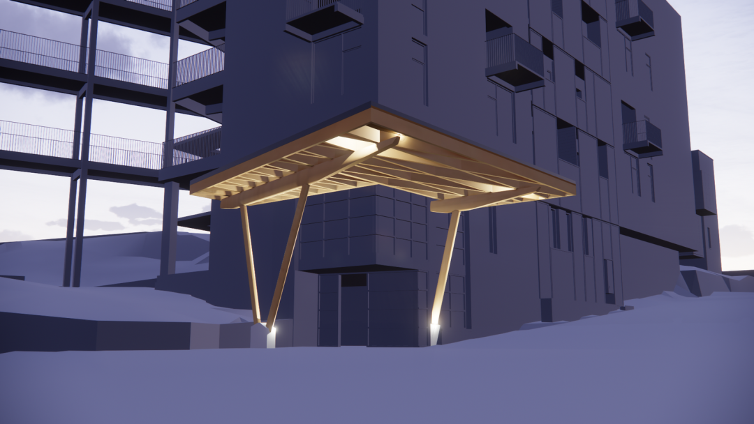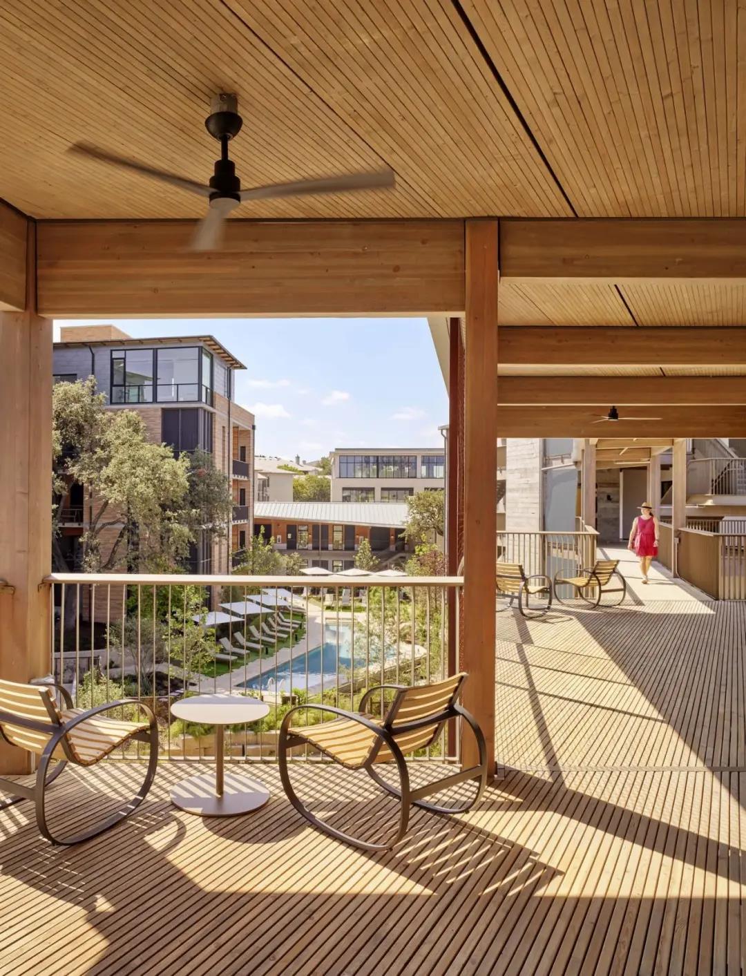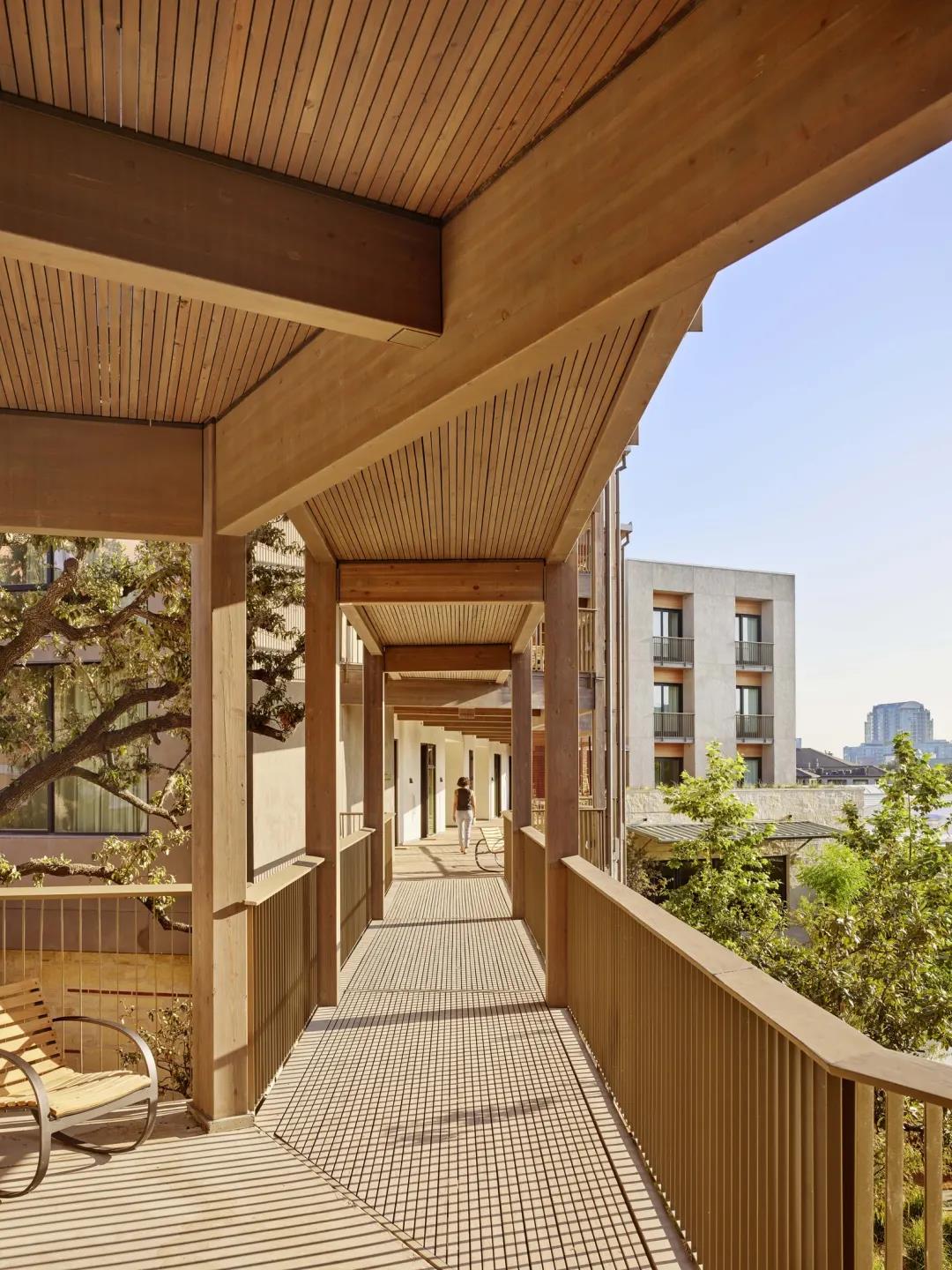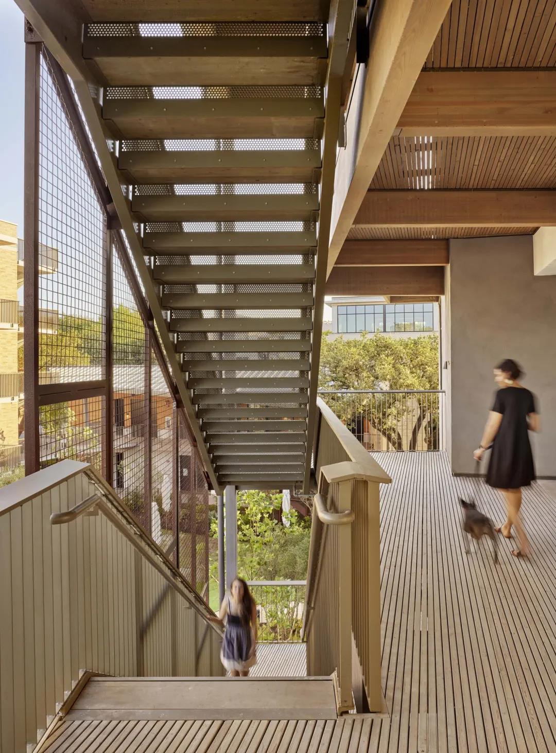 除此之外,還有其他幾處使用了定制的木結構建筑構件,其中包括 DLT 電梯和樓梯井、懸掛式陽臺、樓梯以及入口處的獨立門廊。