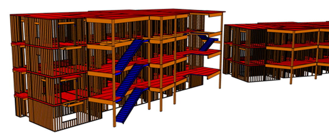 考慮到這些建筑物的墻體、形狀和輪廓都很復雜。設計時對每一面墻都進行了建模,并將它們預制化,以便后期快速安裝。團隊在電梯和出口樓梯處還使用了 DLT 豎井壁,這樣可以實現(xiàn)極快的安裝,同時還可以顯露木材。