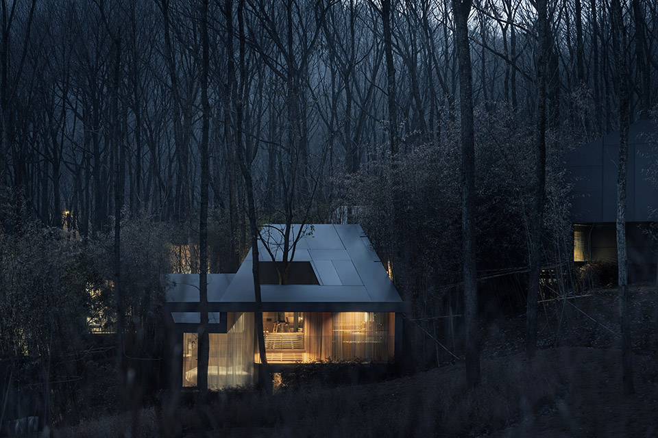 每個小屋中都保留了一棵場地原生的樹木,樹木所占據(jù)的空間成了屋中院,透過玻璃時刻于室內(nèi)生活相伴,是自然向建筑的反向滲透,屋中院也為室內(nèi)衛(wèi)生間提供了具有私密性的風(fēng)景。