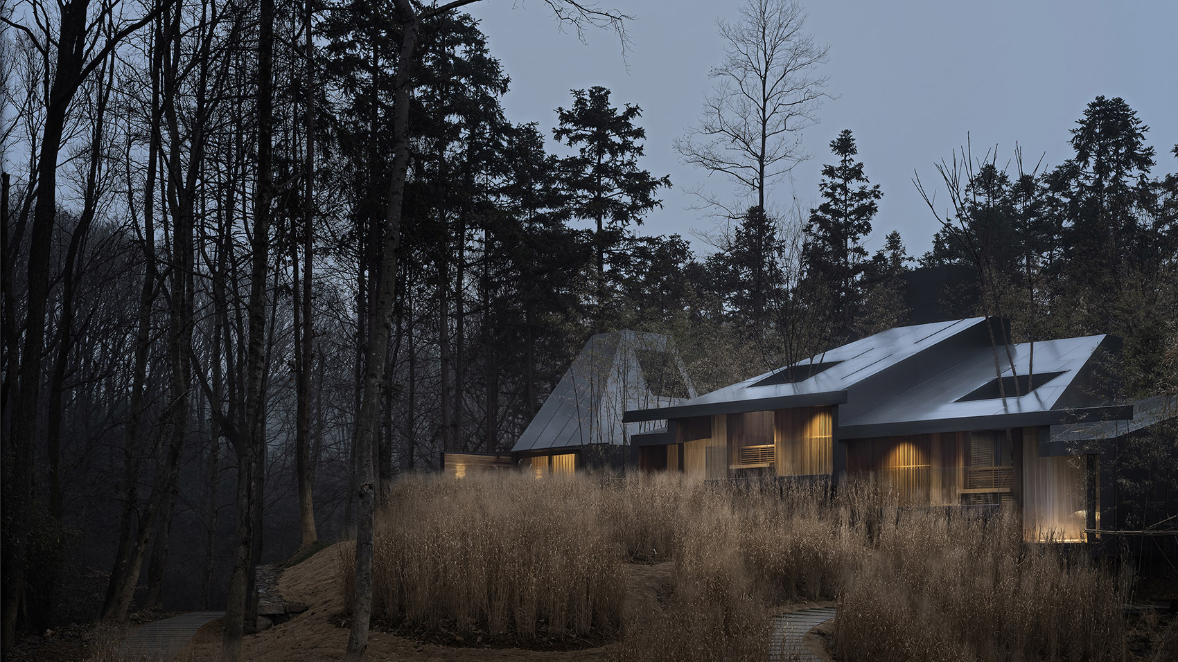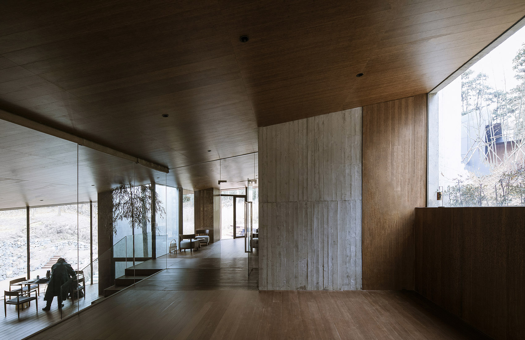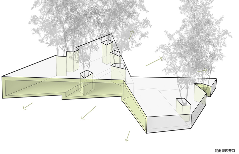 建筑的另外兩側(cè)分別嵌入山體之中,架空的蝶狀建筑的下方仍然保留了溪水和山路的通道。為了將部分樹木保留在室內(nèi),豎向結(jié)構(gòu)被設(shè)計成“柱院”,結(jié)構(gòu)意義上是柱子,空間意義上,是保留了一棵樹的“微院”。屋面是一個臺階狀的坡屋頂,可作為小型演出的森林劇場,室內(nèi)空間被這個大坡屋頂統(tǒng)一起來,并因為不同地面標(biāo)高的變化而富有節(jié)奏。