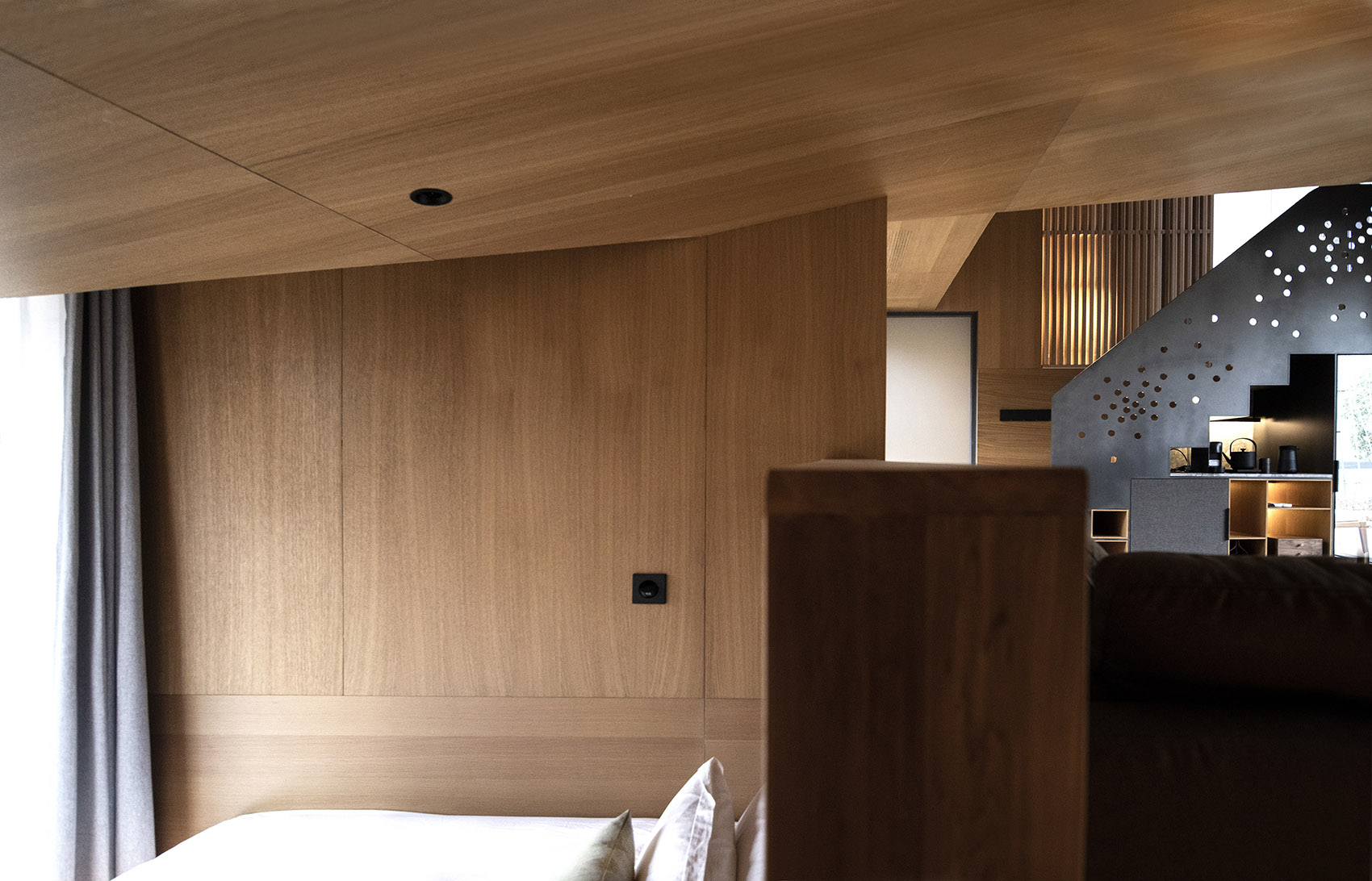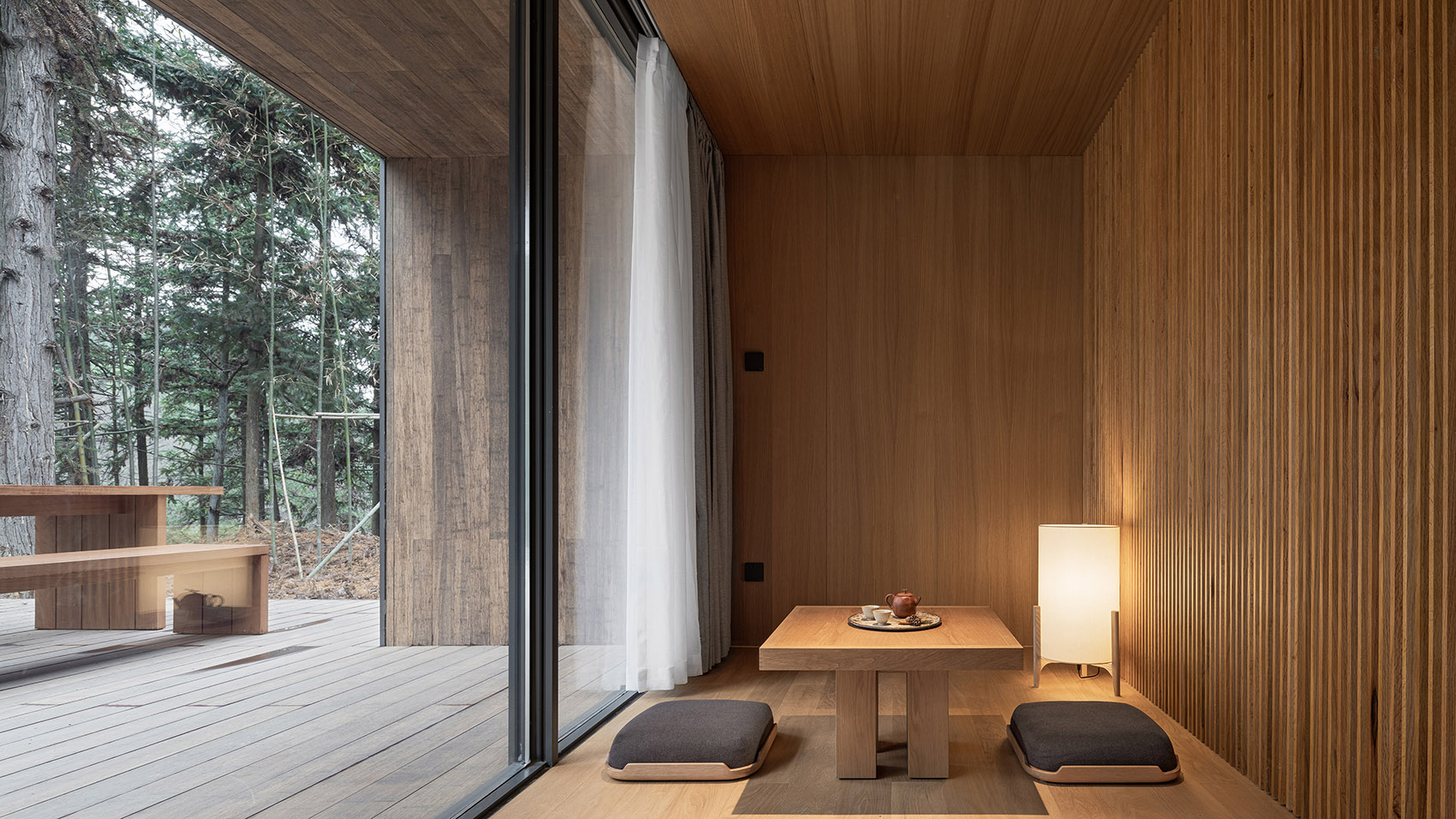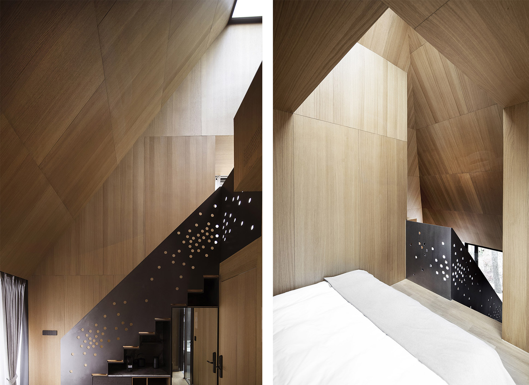 空間的大小是以人的基本尺度來定義的,建筑的墻面和屋頂都觸手可及,這種微小的尺度讓人時刻感受到建筑處于自然之中。這種接近于野營帳篷的空間體驗,希望讓人時刻感受到自然就近在咫尺,只是隔了一層外墻的厚度。通體的木質(zhì)材料提供了溫暖而舒適的建筑內(nèi)襯,給人提供了舒適而愜意的生活氛圍,這和外部自然的野趣形成的強(qiáng)烈的反差,這種反差讓人對自然保持敏感,更能感受到自然之美,或溫柔細(xì)膩,或爆裂冷峻。