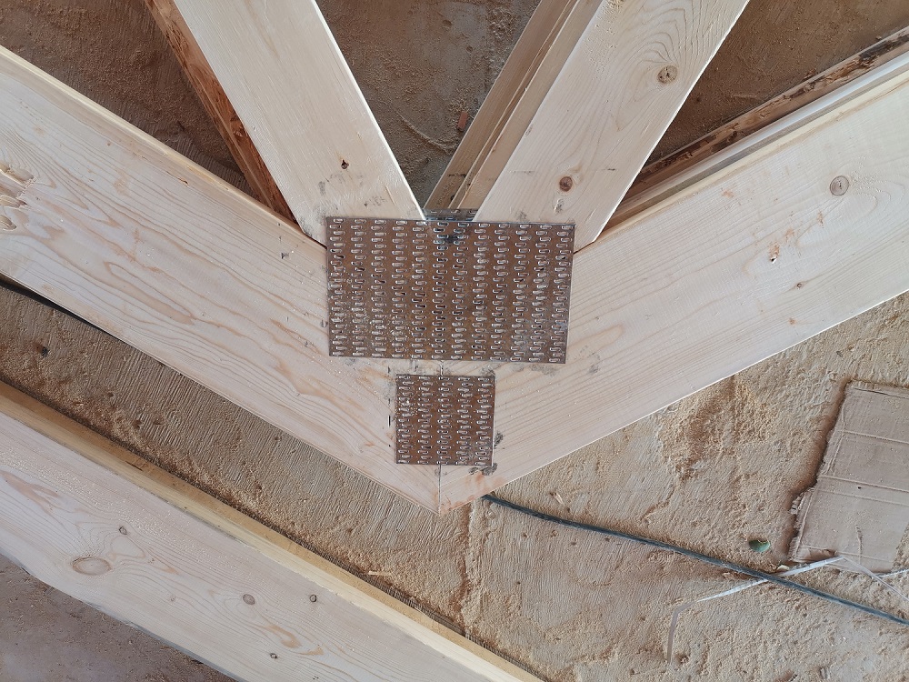 齒板連接主要用于輕型木結(jié)構(gòu)建筑中規(guī)格材制成的輕型木桁架節(jié)點(diǎn)連接。輕型木桁架是北美輕型木結(jié)構(gòu)體系中屋架體系的主要結(jié)構(gòu)形式。其特點(diǎn)是支撐形式靈活,桁架間距較密,通常小于600 mm。在桁架連接處應(yīng)用齒板,可以較快的進(jìn)行桁架中各弦的定位。即在工廠中拼裝好一品桁架后,將桁架平放,同時(shí)用專門的壓力機(jī)將齒板直接壓入桁架中各條弦之間的連接處。齒板連接其最大的優(yōu)點(diǎn)是提高了施工效率,保持了木材的完整性。同時(shí)齒板作為連接件,與木材之間表現(xiàn)較好的協(xié)同作用,塑性性能良好。
