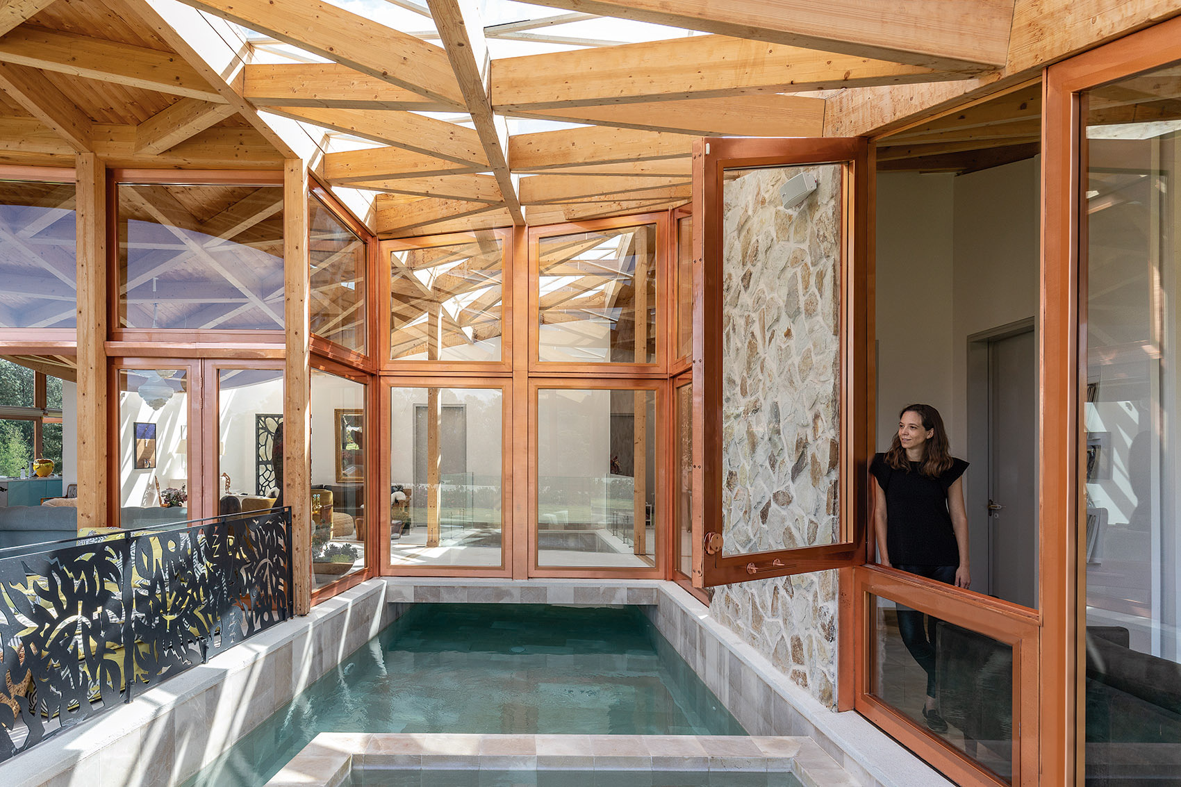 在室內(nèi),一處位于平面中央的縫隙空間將住宅明確地劃分為社交空間和私人空間兩部分,同時也在形式上保留了“莊園住宅”的傳統(tǒng)布局。天窗照亮了室內(nèi)外水池與中央交通空間,同時創(chuàng)造出交叉通風(fēng)與拔風(fēng)效應(yīng),以綠色的生物氣候策略營造出舒適的室內(nèi)體感環(huán)境。